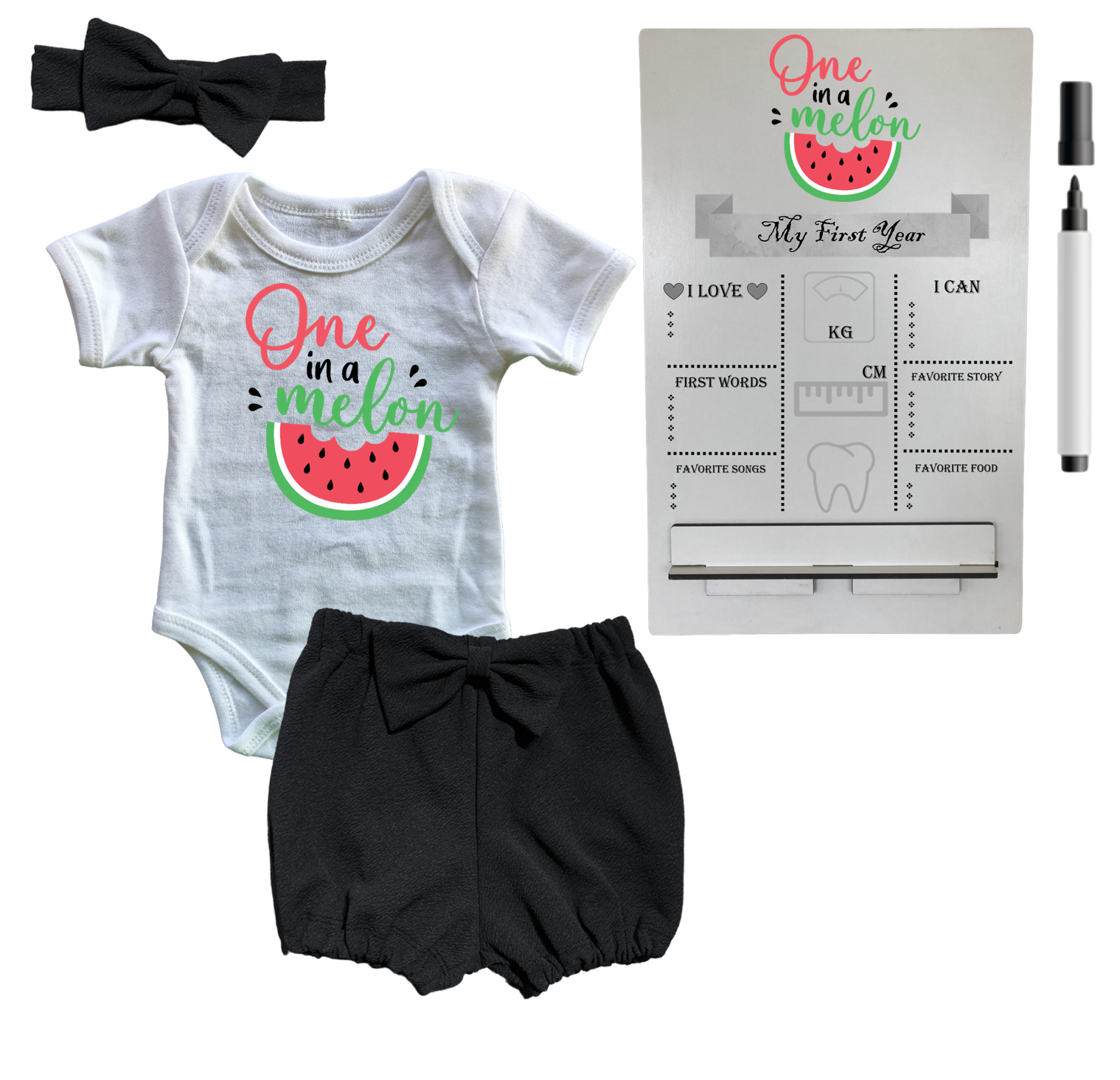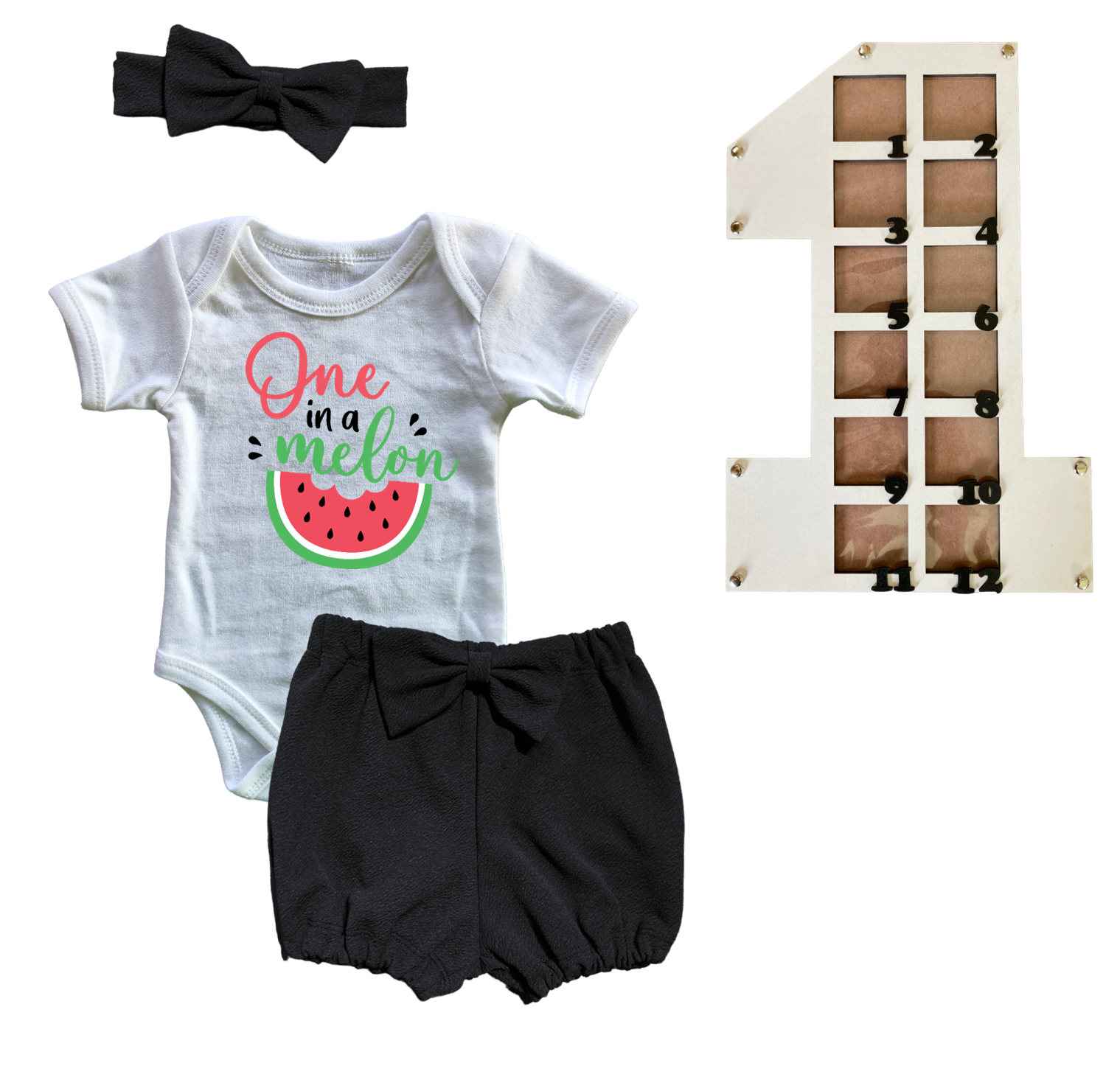1st Birthday | Bubble Shorts, vest & Headband | Photo Frame | Black | One in a Melon