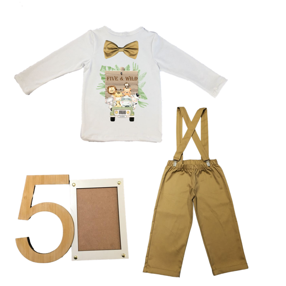 5th Birthday-Wild One/Safari-White & Stone with suspenders & Bow tie-Eng