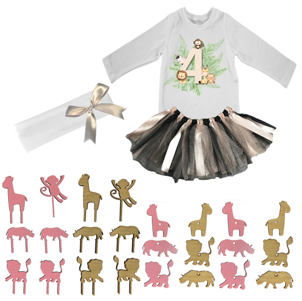 4th Birthday Party Combo Tutu | Cupcake Toppers & Lollipop holders | Safari